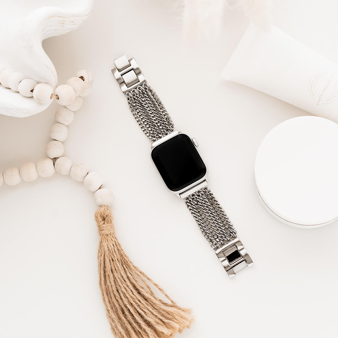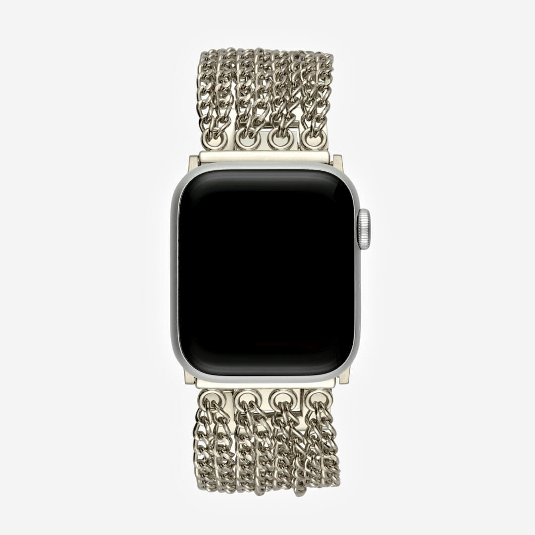 Crafted from premium stainless steel and twisted into elegant link chains, this band is definitely going to become a favourite on your Apple Watch. Need to resize your band to make it smaller? Simply flick open the clasp links with your nail – no tool required! Dimensions 38mm 40mm 41mm 42mm (S10 & S11): F